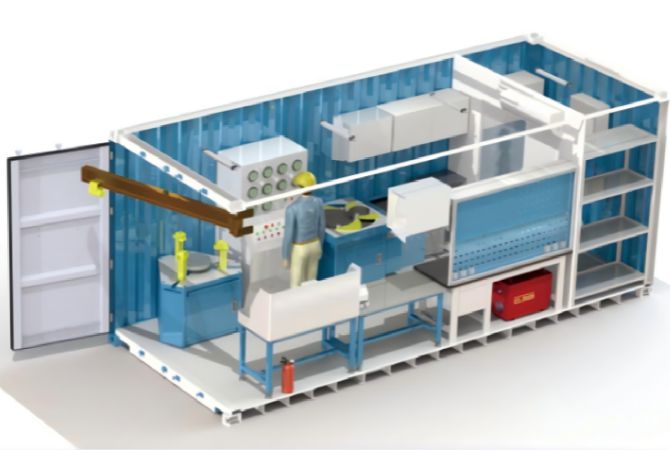A compact 20-foot portable skid-mounted station integrating on-site valve testing, grinding, air compression, heavy-duty workspace, and optional repair tools for comprehensive maintenance of valves up to DN300 and 2500LB.